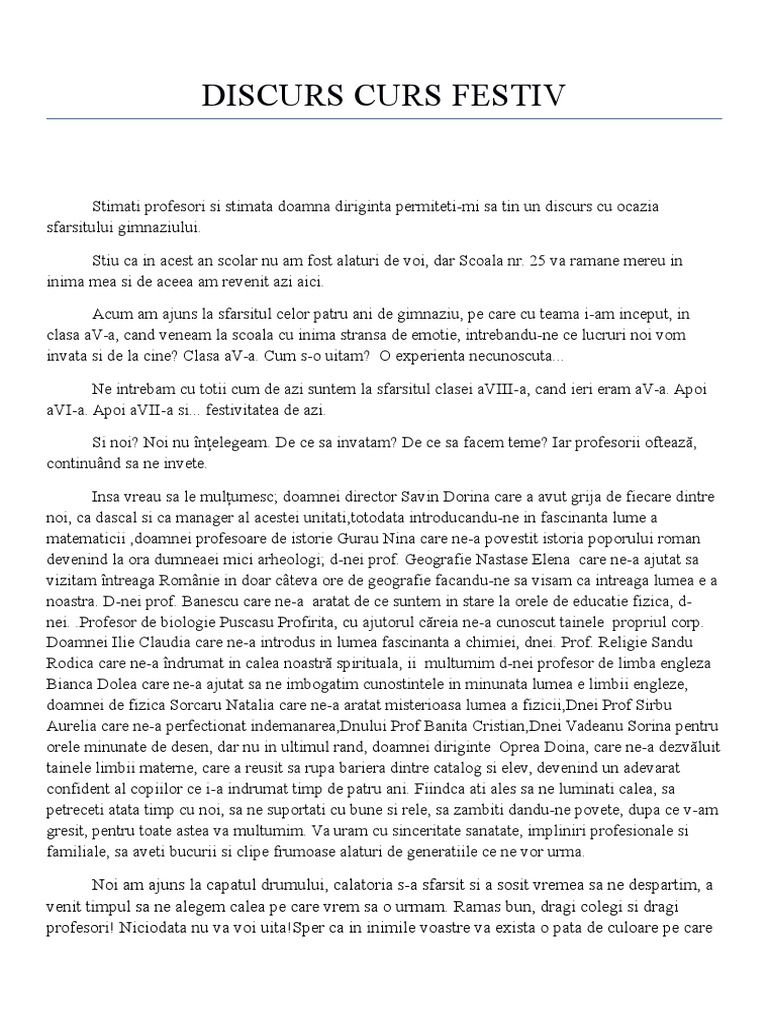 vizitati articolul complet aici : http://www.citatepedia.ro/index.php?q=discursuri+de+sfarsit+de+liceu&r=. Un discurs emotionant, care are la baza o poveste, o prezentare atractiva a celor mai importante proiecte si putina implicare in organizarea unui eveniment de sfarsit de an. As fi vrut sa avem si coronite, dar nu am gasit o solutie. Sa nu lasam sa ne copleseasca agitatia de sfarsit de an, mai bine sa incercam sa ne bucuram de.